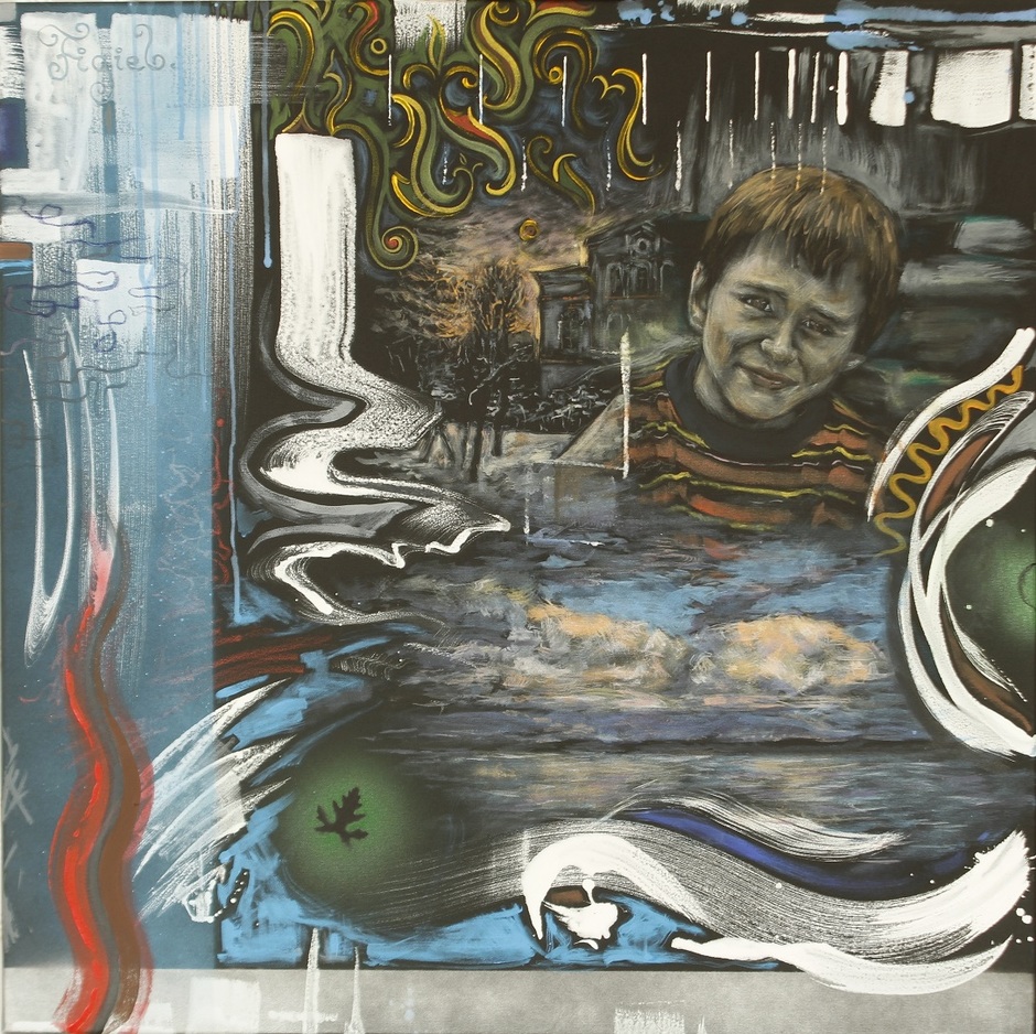 poniżej: "Opowieści o życiu moich dzieci-Iwo Bruno", 2023 r, akryl, olej+pastel olejna na płótnie, format:100x100 cm
